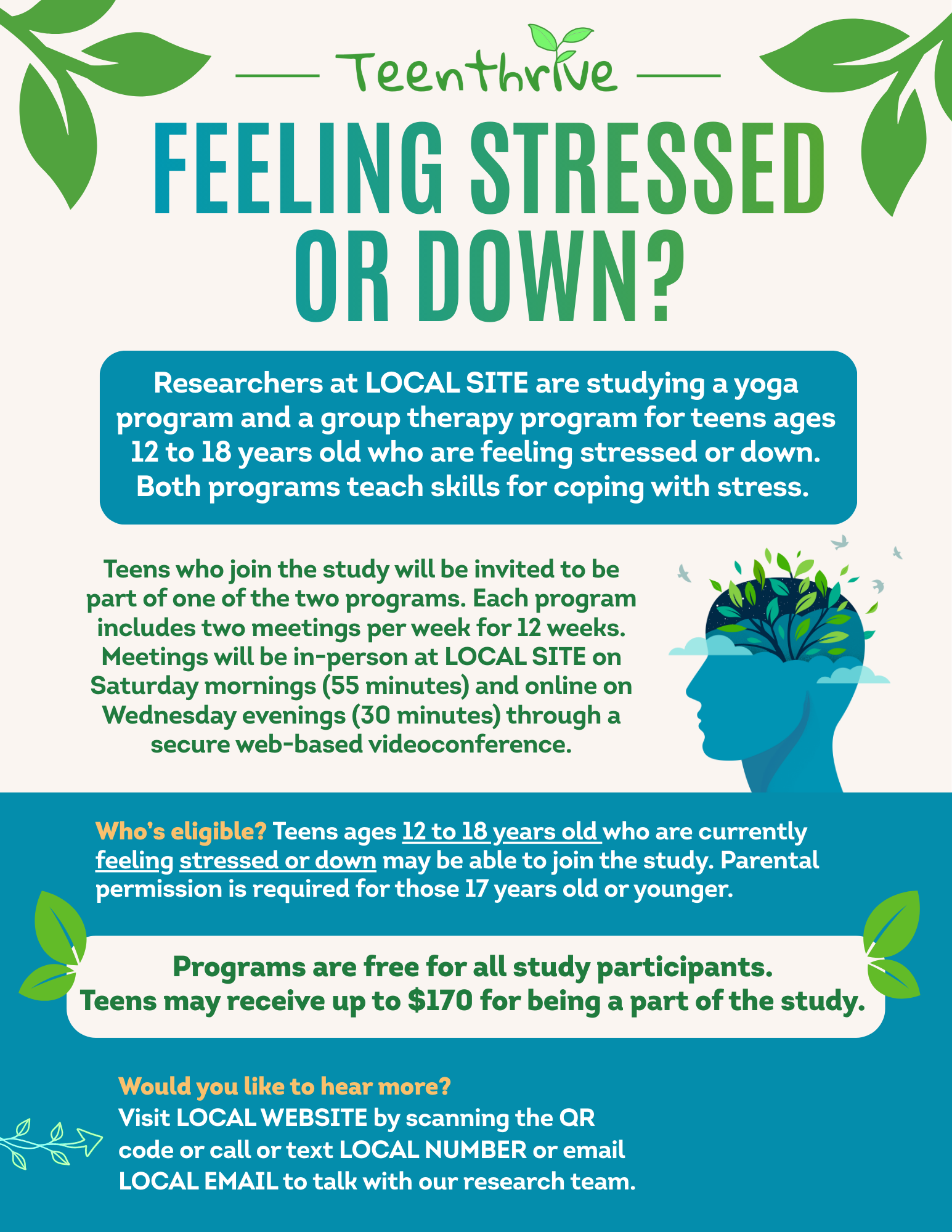 TeenThrive is a research study testing two promising group-based programs for adolescents experiencing elevated depressive symptoms: group cognitive behavioral therapy (gCBT) and yoga. Both approaches have been shown to improve mood and coping in adults, but there is limited rigorous research examining their effectiveness in adolescents. TeenThrive is designed to help fill this gap by comparing these two interventions in a randomized controlled trial.